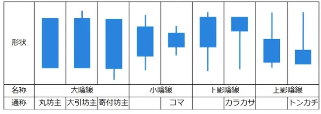 左側が「陽線」右側が「陰線」で、ローソク足の長方形の部分が「胴体」、胴体から上下に伸びているのが「ヒゲ」です。
