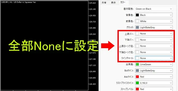 ローソク足を消す方法は、チャート上で右クリック→「プロパティ」を選択し、「上昇バー」「下降バー」「上昇ローソク足」「下降ローソク足」をすべて「None」にして「OK」をクリックします。