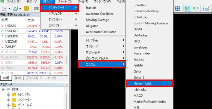 「挿入→インディケータ→カスタム→Heikin_Ashi」の順番にクリックして、チャート上に表示させるだけです。